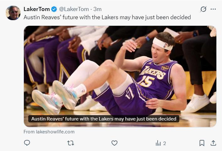 湖媒Lakershowlife長文分析了裏夫斯的近況,隨着裏夫斯的傷勢他的交易價值已經大打折扣,他留在湖人的未來似乎已經定了,明夏他可以跟湖人續約四年1.859億或者是五年2.405億。