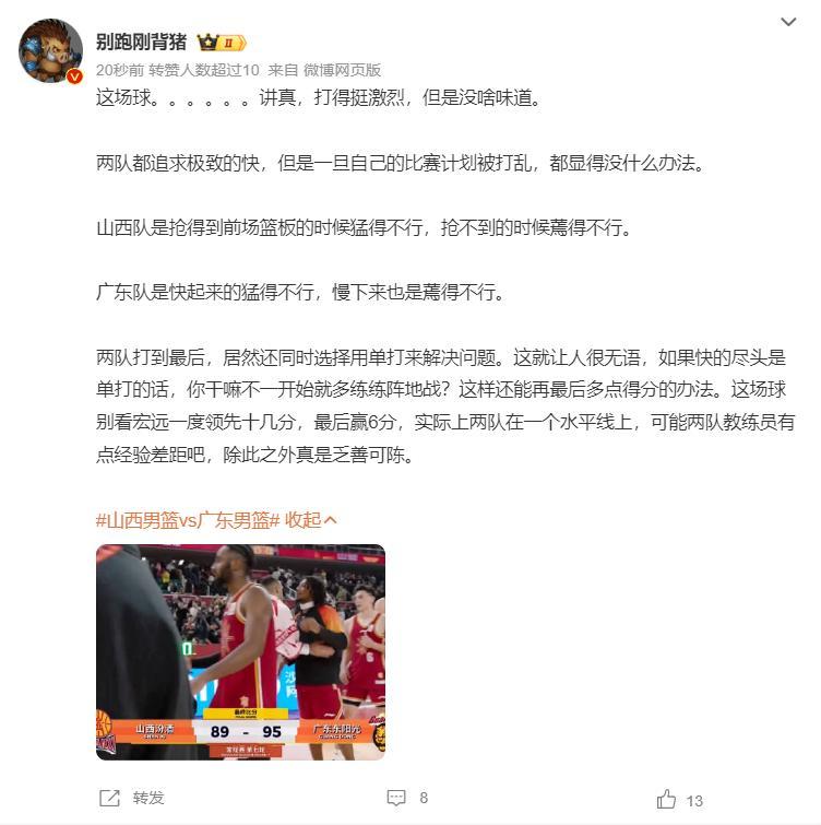 賽後大V別跑剛背豬寫道:這場球打得挺激烈但沒啥味道,兩隊打到最後都是靠單打解決問題,別看廣東一度領先10多20,可最後只贏6分,實際上兩隊在一個水平線上,兩隊教練員有點經驗差距,除此之外乏善可陳。