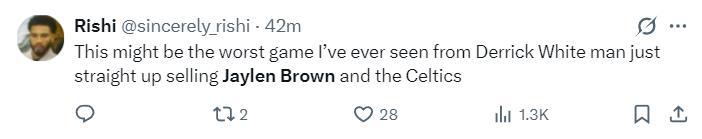 綠凱球迷:這可能是我見過的德里克-懷特表現最糟糕的一次了,他竟然直接把杰倫-布朗的努力給磨滅了。