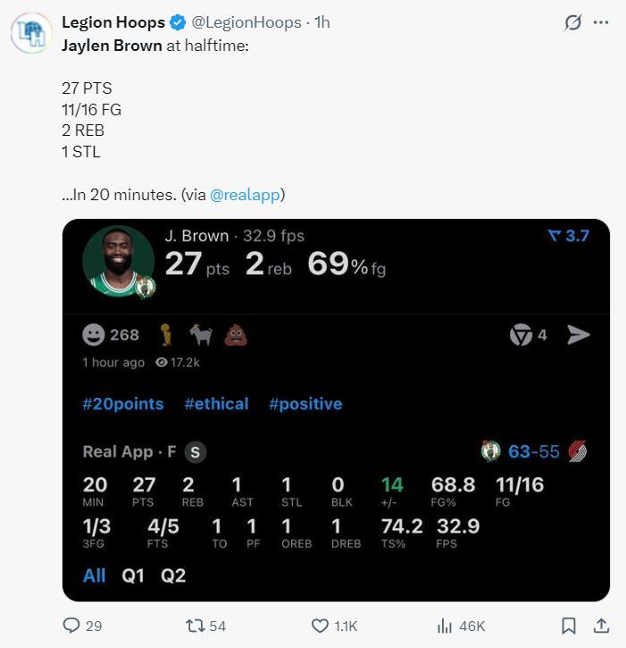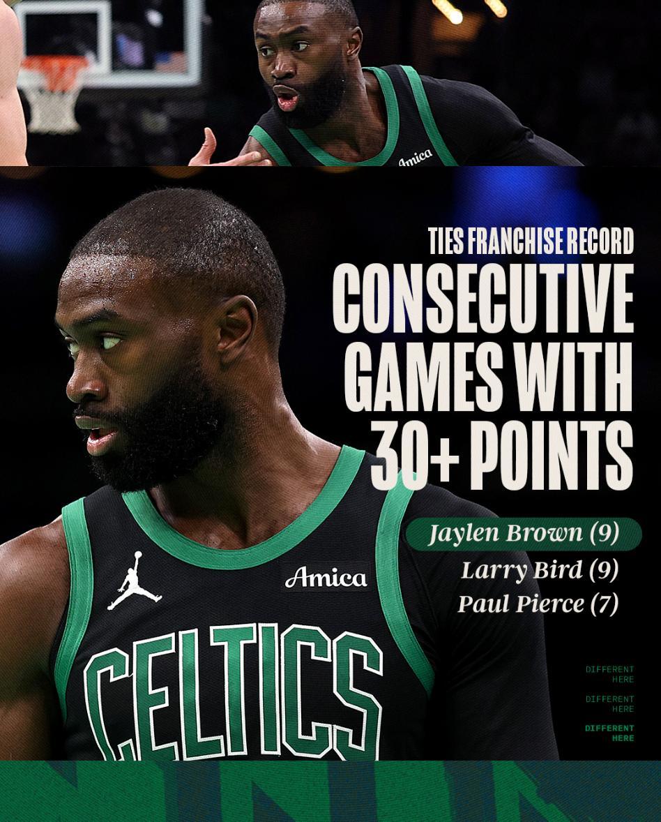 這場比賽布朗真的不該背鍋,他已經連續9場比賽拿到30+比肩隊史第一的拉里-伯德,下一場他再度拿到30+就能獨享歷史第一;除此之外布朗本賽季第19場30+聯盟僅次於SGA。