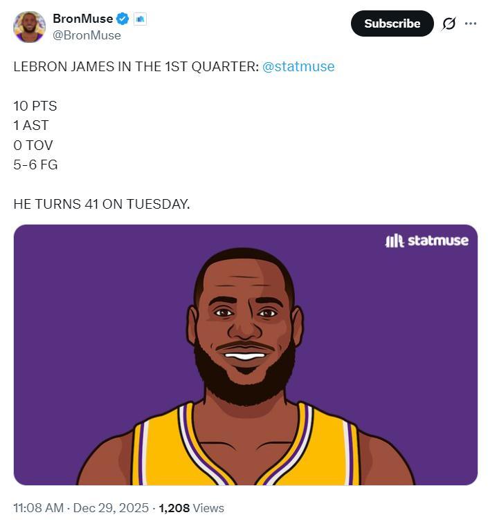 還差兩天就要年滿41歲,老同志開場連續的突破漲分,打了6分鐘拿到6分被換下休息。老同志的身體狀態是真的不錯,登場後命中了兩個高位的中投,單節8分鐘6中5,拿到10分1助攻,勒布朗首節已經上雙了。