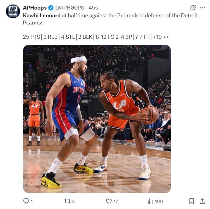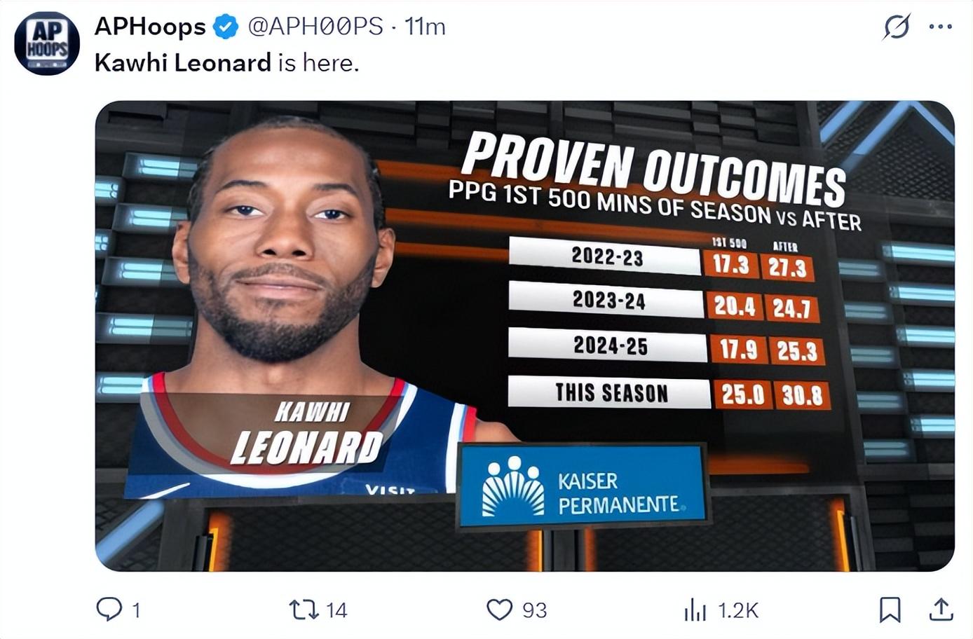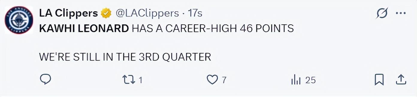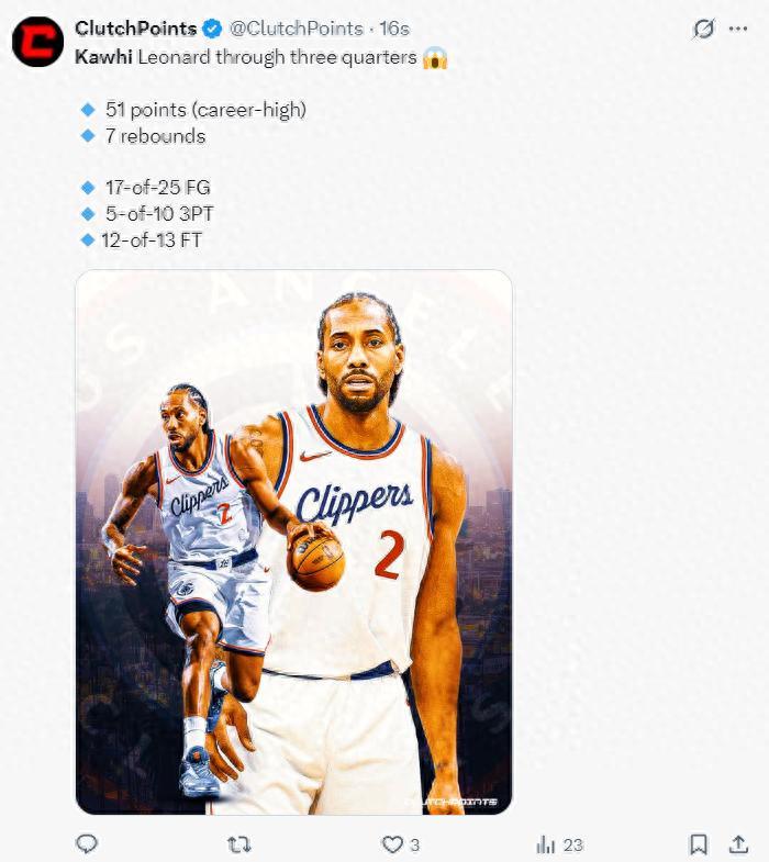 快船官方:萊昂納德已經拿到生涯新高的46分,而且我們還處於第三節。