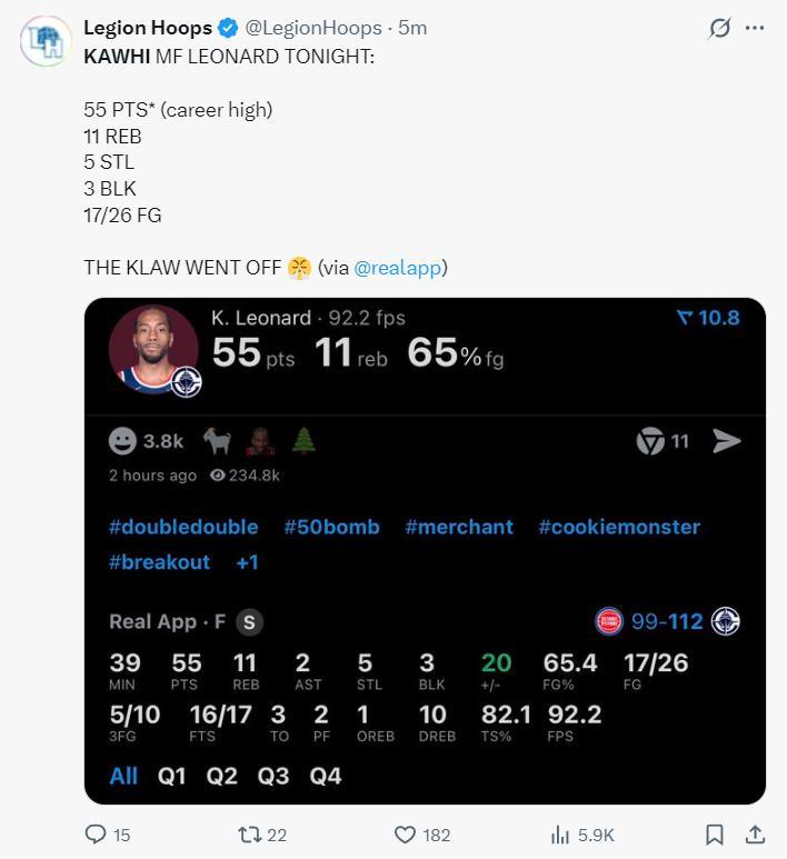 在快船四連勝期間,戰神卡場均39分9.8籃板4助攻2.8搶斷1.5蓋帽,他打出了自己生涯最出色的一個賽季,只可惜快船還是沒有進入附加賽圈層,希望他能延續這個競技狀態下去吧。