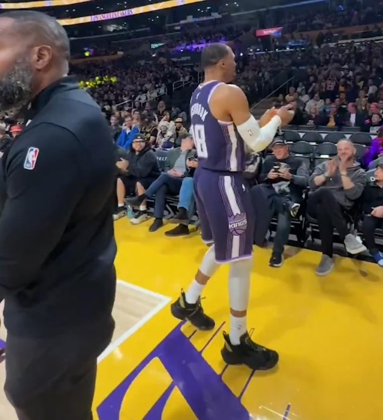 此役37歲的老威少重返斯臺普斯中心,威少的生涯下滑就是從湖人開始,所以他對湖人有別樣的情感,開場雷迪克防他的策略也是沉退,威少弱側底角兩個三分出手命中一個,首節威少7分鐘,5中2拿到5分3籃板1助攻1搶斷。