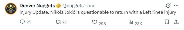 第二節比賽即將結束時約基奇意外被隊友踩到腳,隨後約基奇倒地不起,約基奇最終是被攙扶一瘸一拐離場,掘金官方宣佈約基奇左膝受傷本場比賽迴歸存疑。過了10分鐘左右掘金官方發聲約基奇此役不會迴歸。
