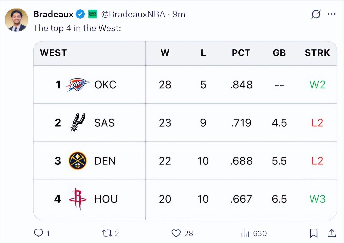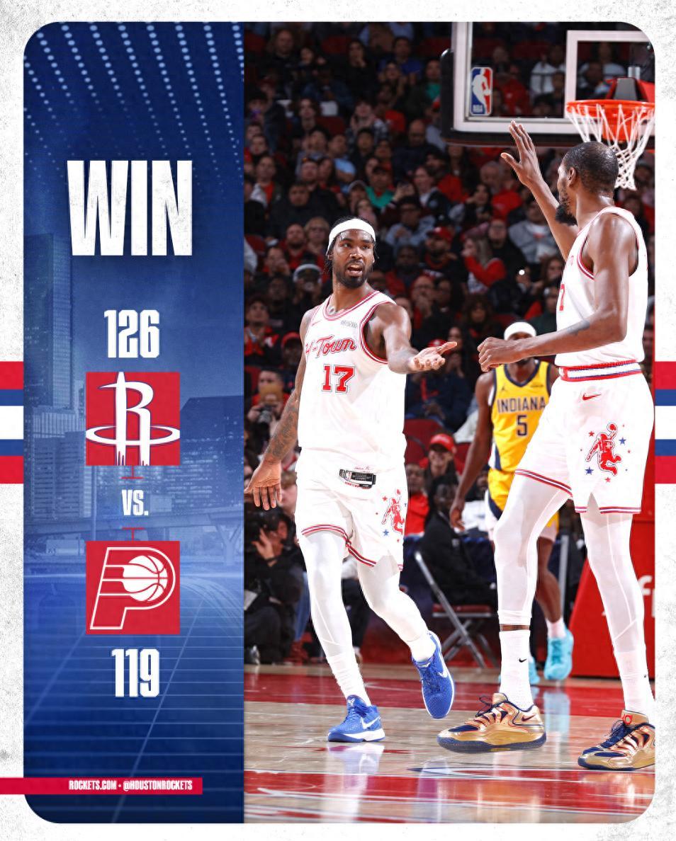 火箭隊經歷這一波三連勝後戰績20勝10負反超湖人升至西部第四的位置,火箭與掘金的勝場只差1個,距離西部第二的馬刺也只差2個勝場。