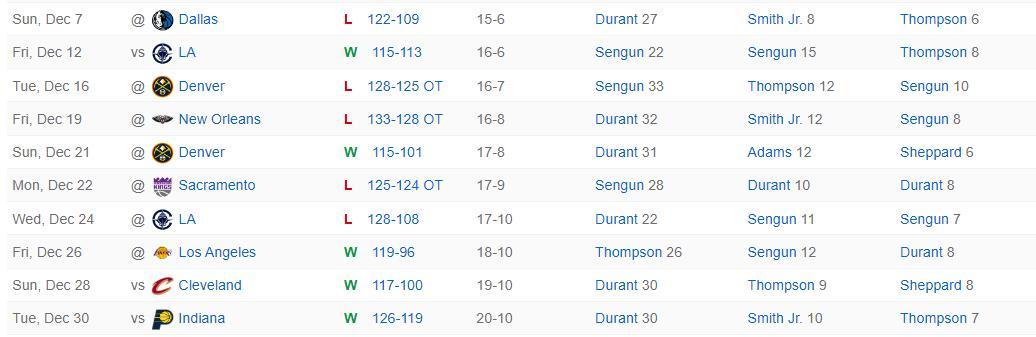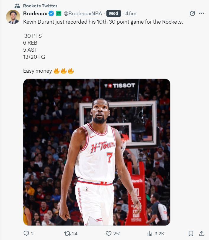 在申京傷缺的兩場比賽中杜蘭特都拿到30+,此役杜蘭特33分鐘,20中13,三分6中2,拿到30分6籃板5助攻1蓋帽,命中率65%,三分命中率33.3%。杜蘭特已經在火箭生涯拿到10次30+。