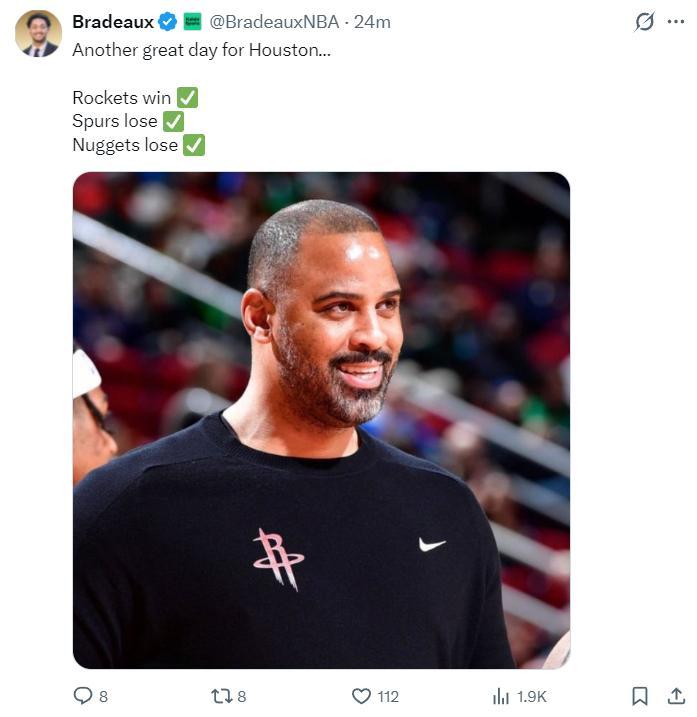 這個夜晚對於火箭來說還是三喜臨門,因爲馬刺不敵騎士、掘金不敵熱火,火箭則擊敗了步行者,掘金的核心尼古拉-約基奇還遭遇了膝蓋傷勢。
