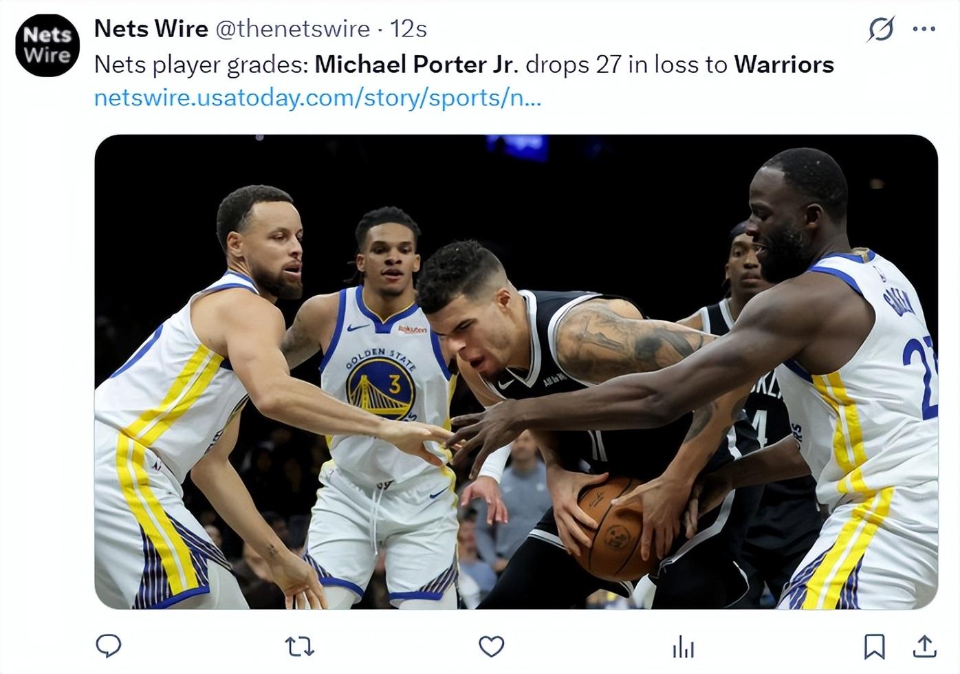 北京時間12月30日,NBA常規賽,籃網以107-120不敵勇士。這場比賽籃網在末節崩盤,籃網的三連勝被終結,勇士新秀理查德決勝時刻兩個搶斷+10分成爲勇士英雄,籃網這邊小波特還是延續了自己高光的發揮,全場比賽27分9籃板5助攻3搶斷攻防一體。