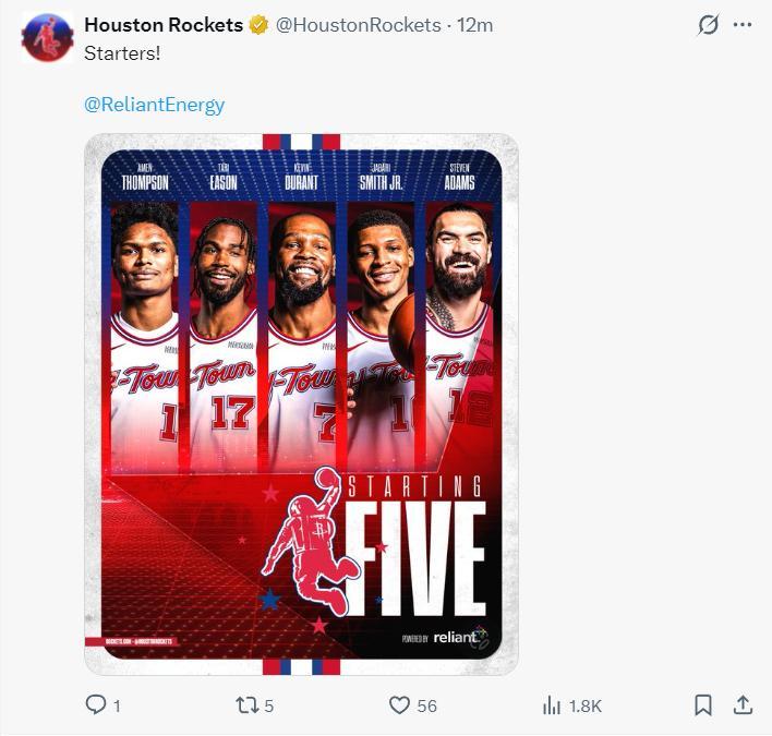 火箭:阿門、杜蘭特、伊森、史密斯、亞當斯;