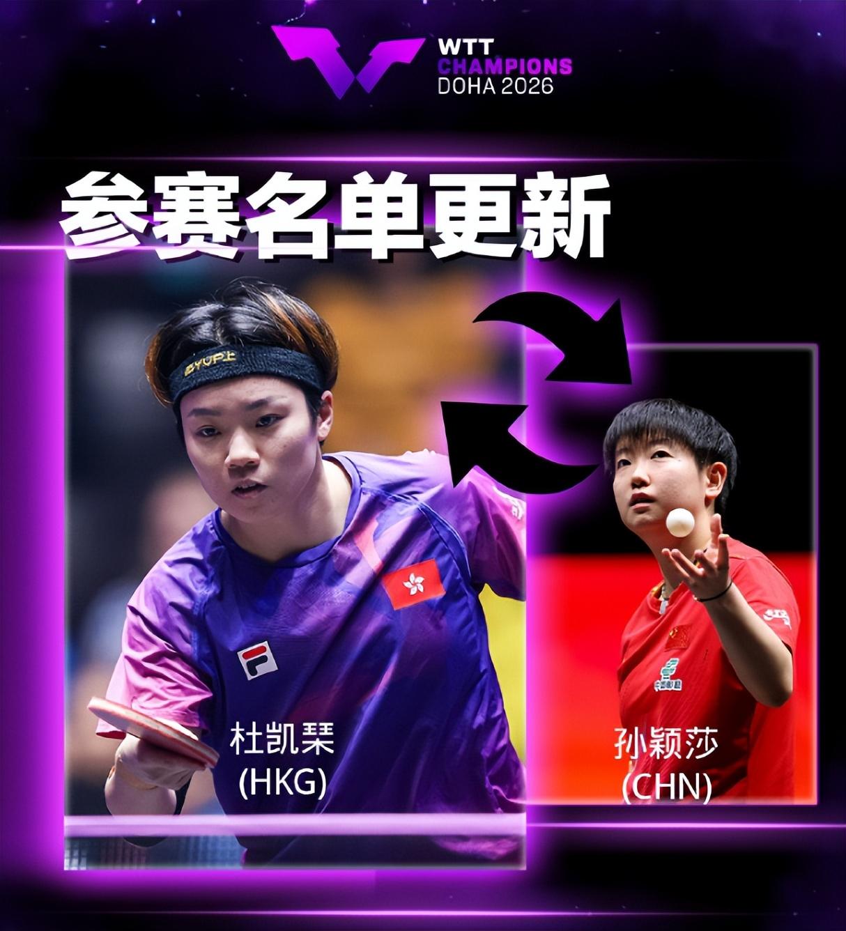 12月29日根據WTT官方的消息,2026年1月11日舉行的WTT多哈冠軍賽孫穎莎確定退賽,杜凱琹將頂替孫穎莎進入多哈冠軍賽。