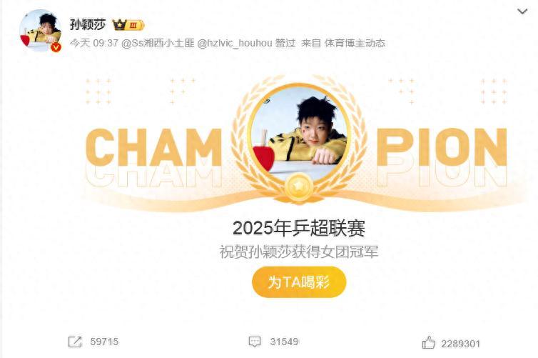 孫穎莎因爲左腳踝扭傷並沒有跟隨深圳大學前往南京打乒超總決賽,最終深大在蒯曼、平野美宇、覃予萱的帶領下拿到2025年乒超總決賽的女團冠軍,雖然孫穎莎沒有打可她是深大的一員,她躺着拿到這個冠軍,算是2025賽季完美的收官。