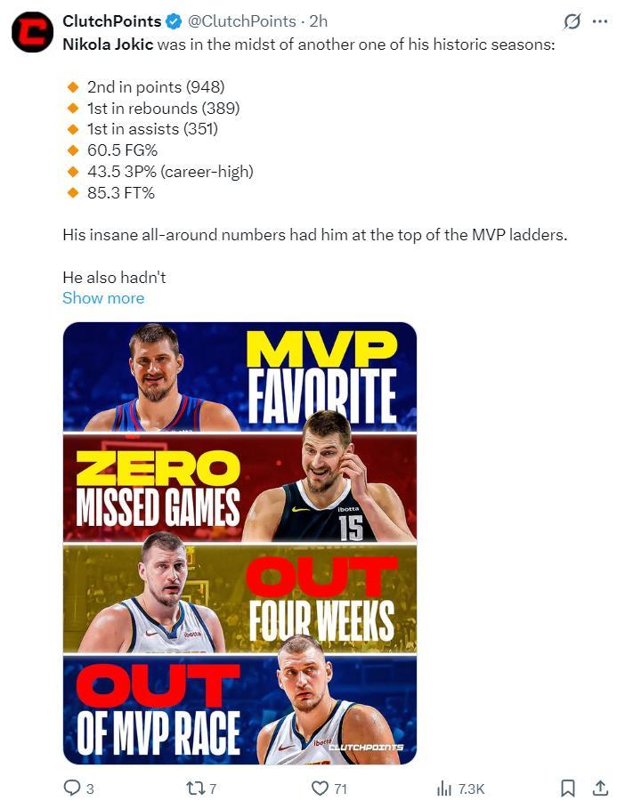 第二方面的打擊就是約基奇的出場次數,缺少18場比賽那麼約基奇就算之後全勤都只有64場,那麼說他要想趕上評獎,他必須提前復出。(約基奇前32場是全勤)