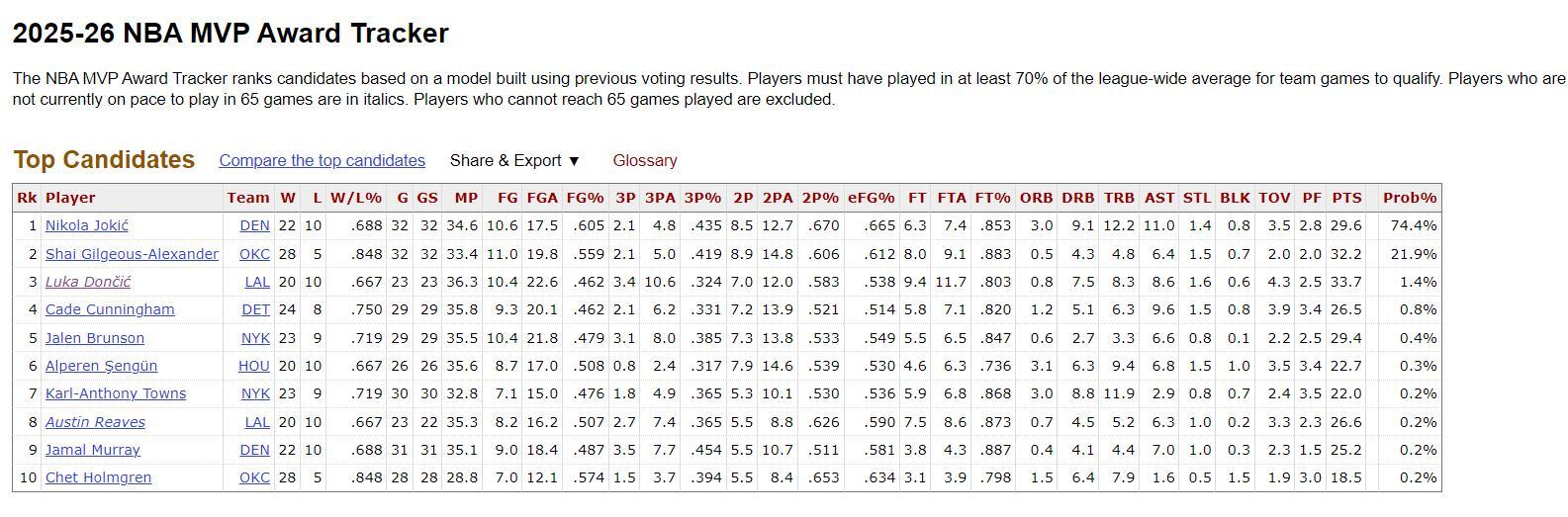 約基奇的膝蓋傷勢讓亞歷山大成爲第一受益人,因爲約基奇場均接近30+三雙(命中率超過六成)的表現遠勝亞歷山大,可一旦約基奇登場的場次不足65場,那MVP就變成SGA的探囊之物了,其餘的球員很難跟約基奇、SGA相抗衡。