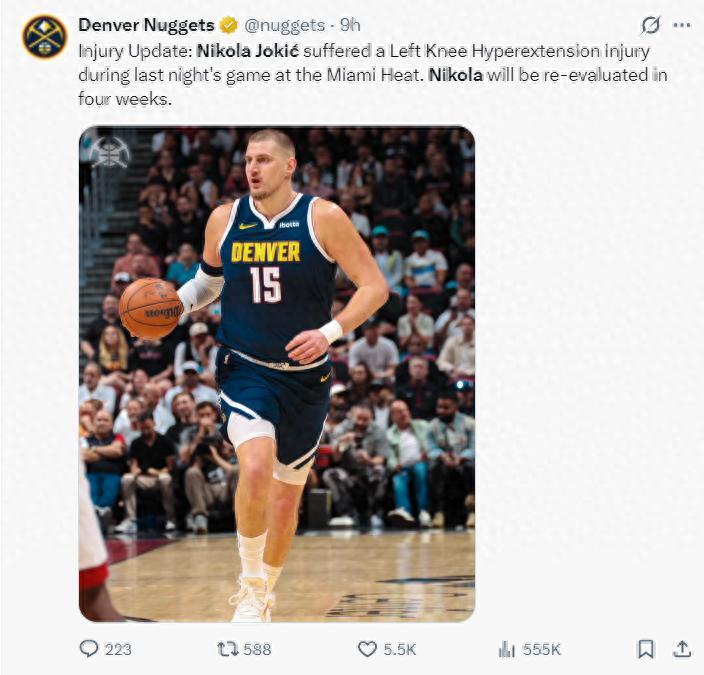 北京時間12月31日,丹佛掘金官方宣佈,尼古拉-約基奇遭遇了左膝過伸的傷病,但膝蓋的韌帶沒有結構性傷,他的傷勢將在四周後重新評估。換言之約基奇至少要缺席四周,這一個月的時間對於掘金來說是巨大的打擊。