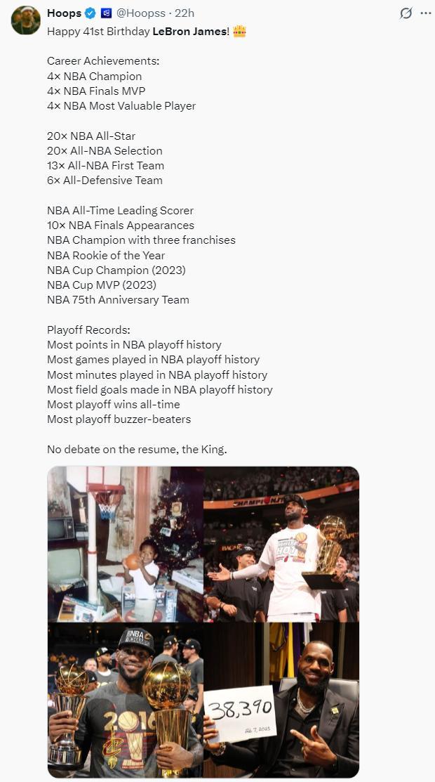 BR寫道:4次總冠軍、4次常規賽MVP、歷史得分王、參賽場次最多、助攻榜第三、三分球第五、蓋帽數第五、唯一1萬助攻+1萬搶斷、最多一陣、季後賽得分最多、季後賽最多勝場、淘汰賽中得分最高、最年輕場均30+、最年長場均30+,他就是GOAT。