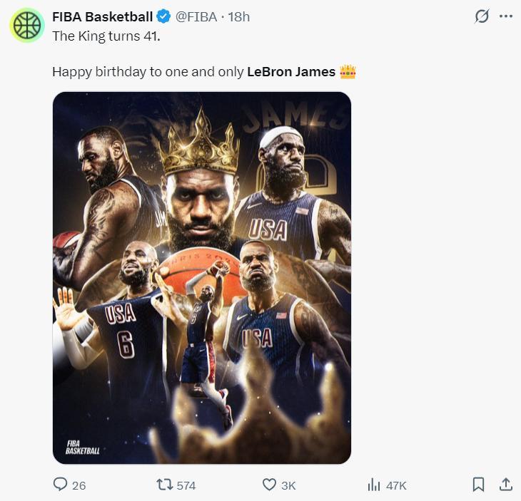 就連FIBA官方都爲老詹送上41歲生日的祝福。