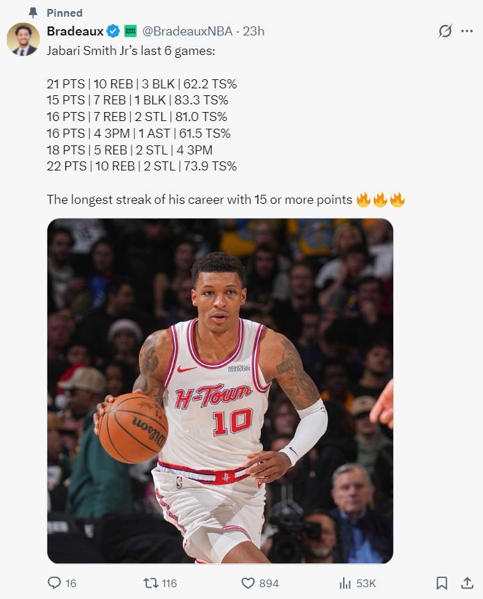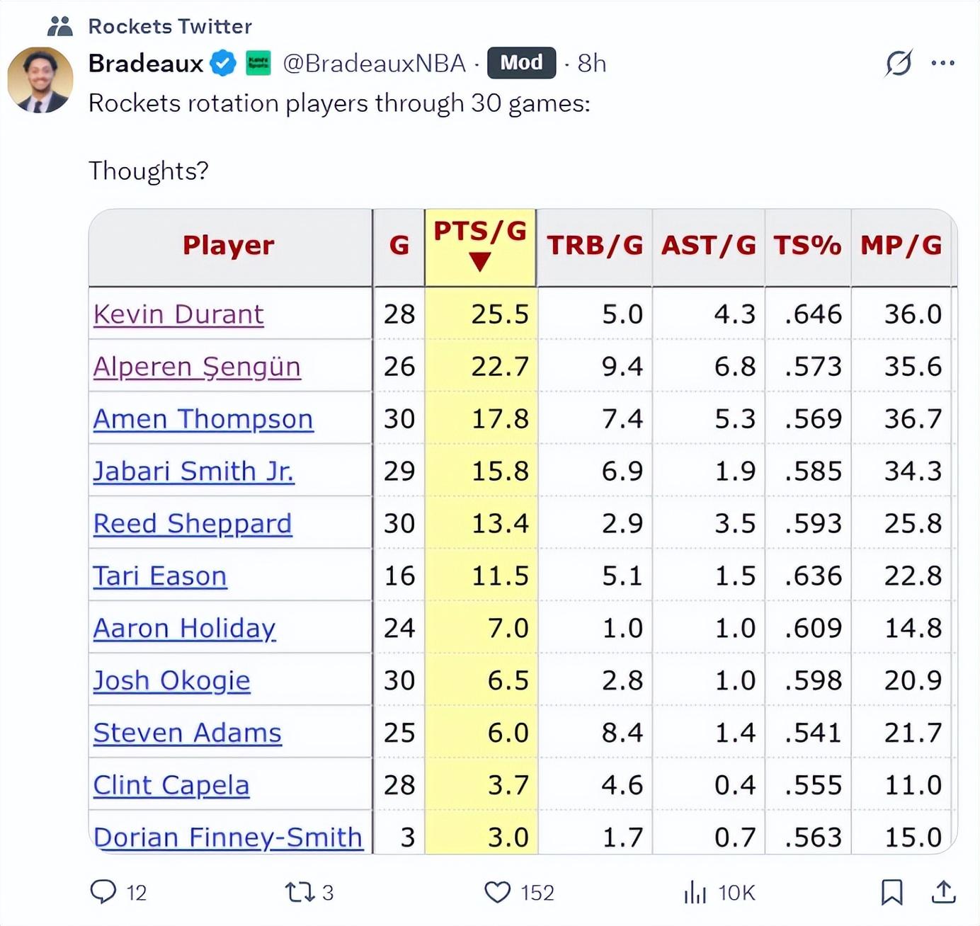 火箭記者Bradeaux總結了球隊前30場比賽,戰績20勝10負西部第四,杜蘭特25.5分第一,申京22.7第二,阿門17.8分第三,小賈15.8分第四,謝潑德13.4分第五,伊森11.5分第五,火箭五人上雙。