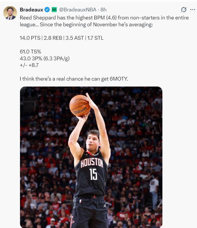 他還表示謝潑德自11月以來,他是非先發BPM最高(4.6)的球員,場均拿到14分2.8籃板3.5助攻1.7搶斷,真實命中率61%,三分命中率43%,正負值+8.7,謝潑德是最佳第六人的有力爭奪者。