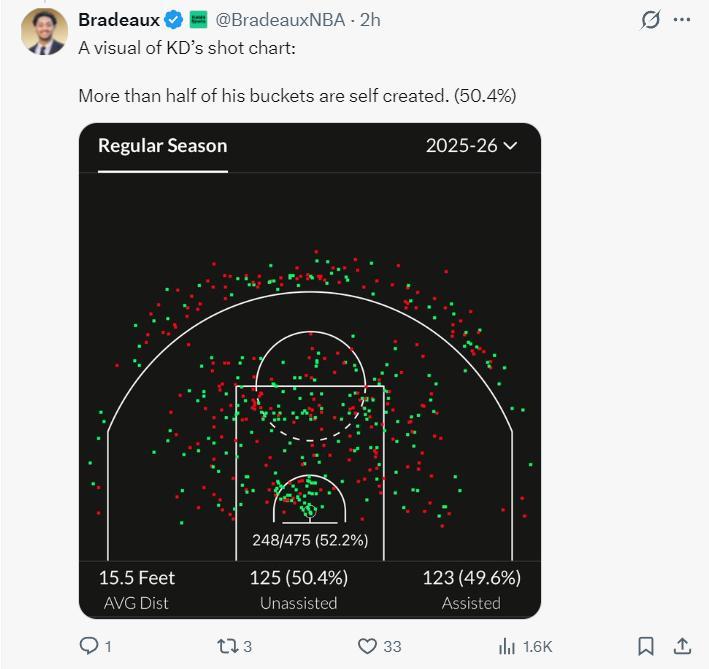 杜蘭特更強悍,37歲的他命中率52.2%,三分命中率43.7%,而且他的出手佔比有50.4%是自主創造的進攻機會,這樣的KD依舊還在巔峯。