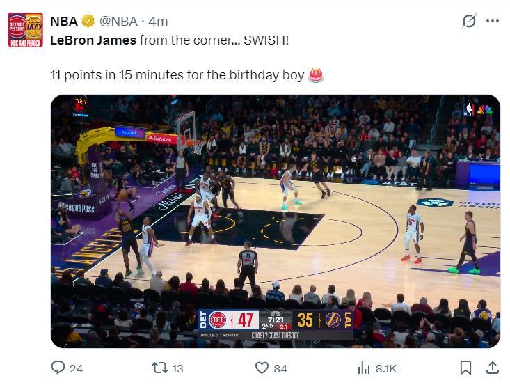 這場比賽是勒布朗-詹姆斯41歲的生日夜,詹姆斯生日夜場均32.9分7.1籃板6.9助攻,命中率55.5%,戰績是5勝5負,他是歷史生日夜場均得分最高的球員。