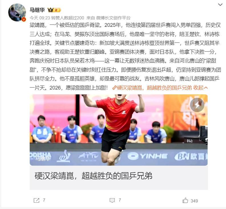 馬繼華老師在新年之際爲梁靖崑寫了一篇長文,他盛讚梁靖崑是硬漢,腰傷反覆退出乒超,依舊堅持幫助國乒拿到亞錦賽冠軍,對陣日本隊的決勝一分蕩氣迴腸,他連續四屆世乒賽闖入男單四強歷史第三人。