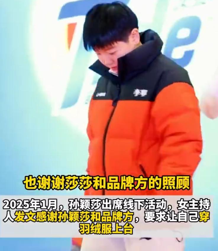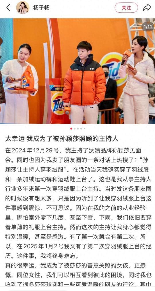 一位叫楊子暢的主持人在2024年12月29日受到了孫穎莎的照顧,活動當天天氣非常寒冷,孫穎莎說了一句‘希望主持人能穿上羽絨服’主持,結果她第一次在戶外能穿上羽絨服、加絨運動褲、運動鞋主持。