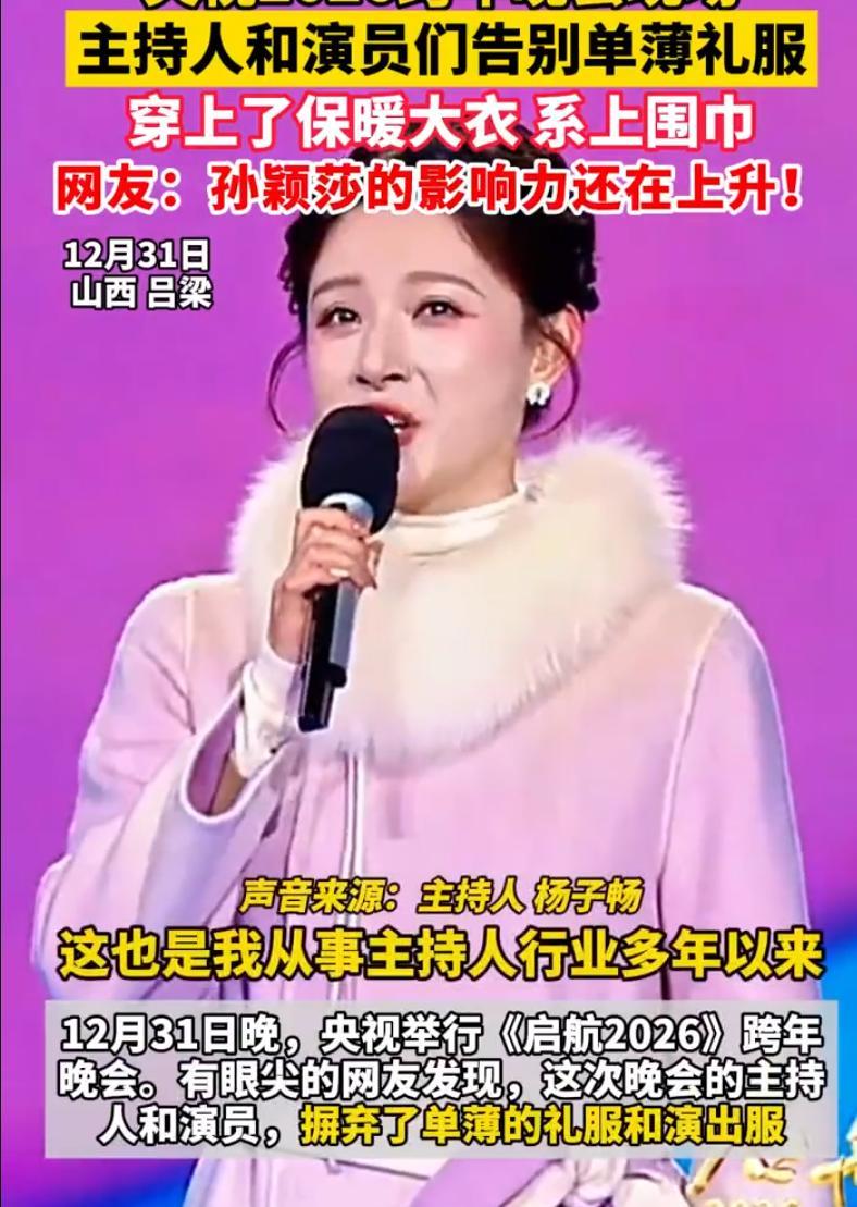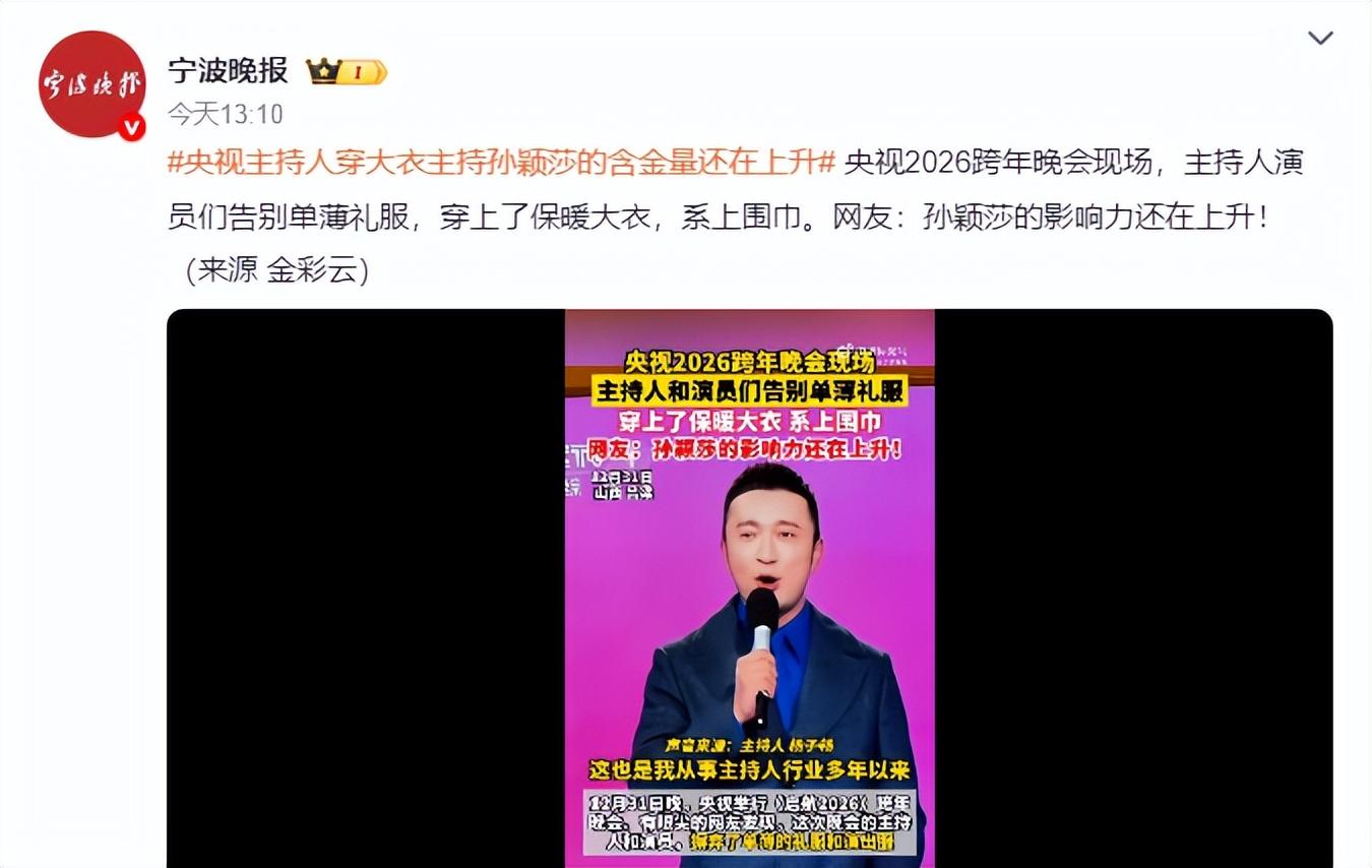 北京時間1月1日,根據《寧波晚報》的消息,央視2026年跨年晚會主持人們告別了單薄禮服穿上了保暖大衣繫上圍巾,網友們紛紛盛讚孫穎莎的影響力還在提升。