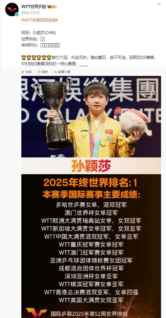 12月31日WTT官方也曬出了孫穎莎整個2025賽季的榮譽,他拿到了世界盃女單冠軍、世乒賽女單冠軍,單賽季有6個單打冠軍,孫穎莎也蟬聯女單世界第一的席位,外戰無失更是炸裂。