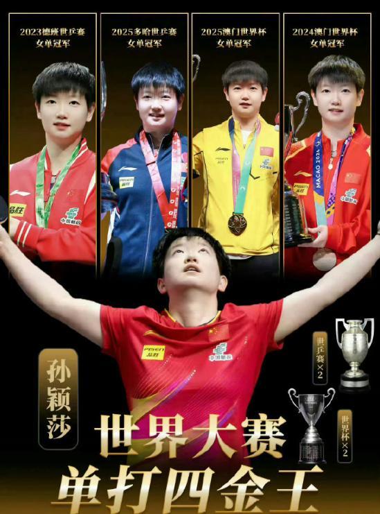 2025年孫穎莎包攬世乒賽女單、混雙(搭檔王楚欽)及世界盃女單冠軍,成爲乒壇首位實現世乒賽雙圈金滿貫的女子運動員。全年斬獲單打六冠,外戰61場全勝,終結日本選手橋本美和11連勝國乒紀錄。
