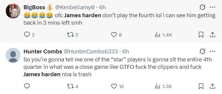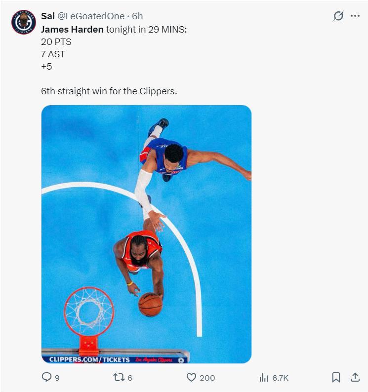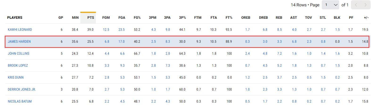 哈登全場比賽28分53秒,14中5,三分6中1,罰球11中9,拿到20分7助攻3籃板1失誤,命中率35.7%,三分命中率17.6%,真實命中率53.1%,正負值+5。雖然效率不佳但他在場對快船是正效率,可末節哈登被DNP了。