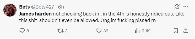 6.哈登在第四節沒有登場,這實在是太荒謬了,這種行爲不該被允許,我真的要FXXK。