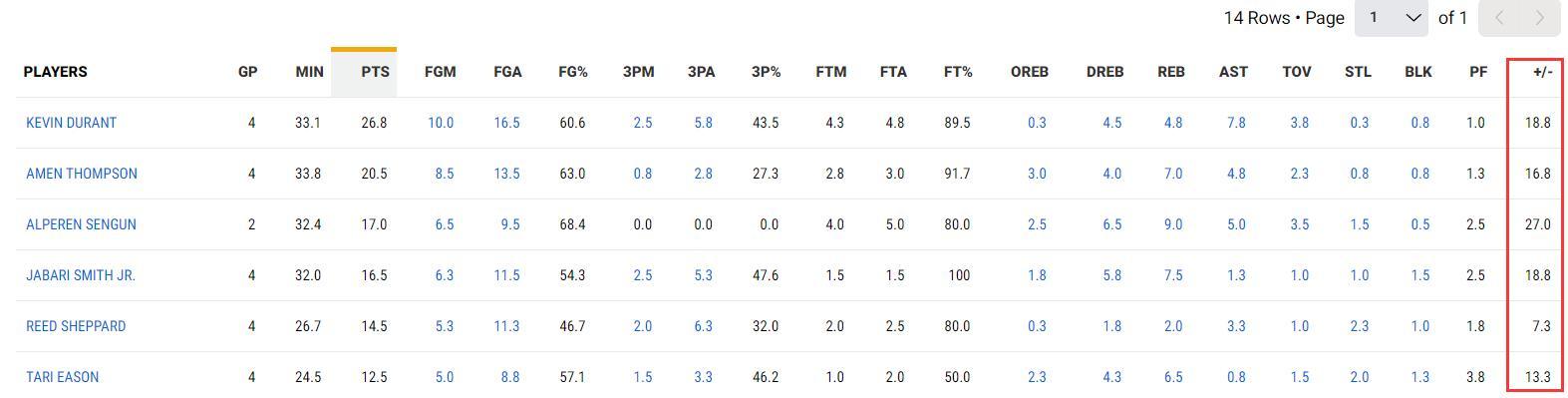 這一波四連勝,杜蘭特場均33.1分鐘,拿到26.8分4.8籃板7.8助攻0.3搶斷0.8蓋帽,命中率60.6%,三分命中率43.5%,正負值+18.8,四場比賽合計正負值+75火箭最高,就連火箭球迷追捧的伊森也只有+53。