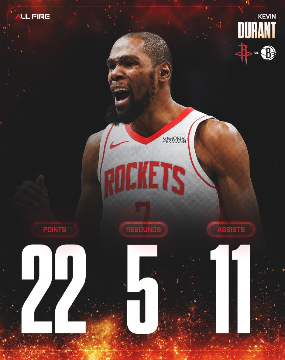 此役後火箭拿到21勝10負跟西部第五的湖人拉開到1個勝場,火箭距離西部第三的掘金也只剩下1個勝場,杜蘭特在這一波四連勝中的貢獻是火箭最高的。
