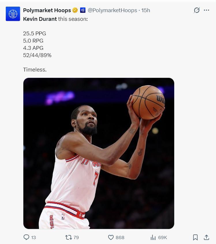 本賽季37歲的杜蘭特場均36分鐘(聯盟第四),場均25.5分5籃板4.5助攻0.8搶斷0.9蓋帽,命中率52.2%,三分命中率43%,罰球命中率89.6%,他的罰球只差0.4%就可以再度達成180俱樂部。