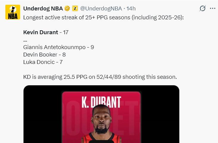 杜蘭特這種表現其實已經稀疏平常,他已經連續17個賽季場均25分以上,算上本賽季他也比揚尼斯9次、布克8次、東契奇7次更多。