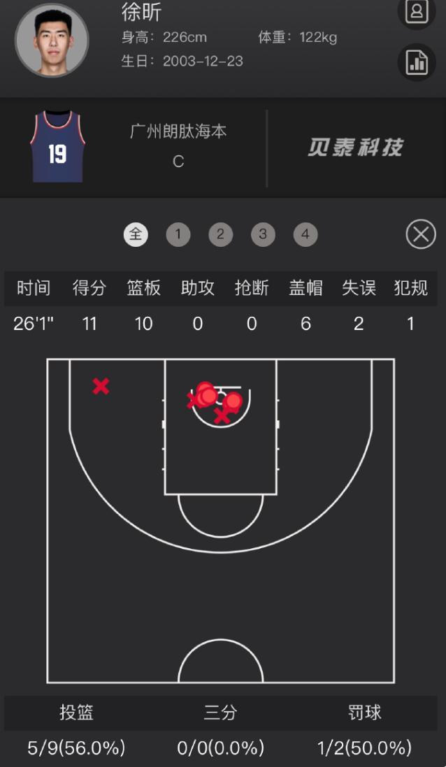 對陣山西一戰26分鐘,9中5,拿到11分10籃板6蓋帽;