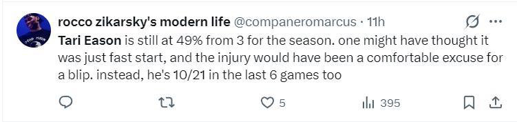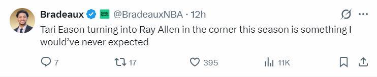 火箭記者Bradeaux繼續寫道:本賽季塔裏-伊森的三分表現竟然跟雷阿倫如出一轍,這讓我意想不到。