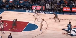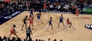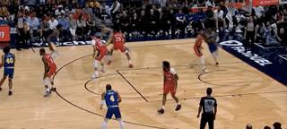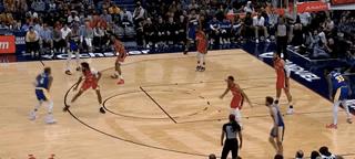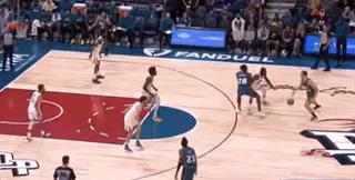 擋不住人就算了,還要給隊友帶去更大的防守壓力,這種事情懷斯曼也沒少幹。這一回合,懷斯曼在穆迪突破的時候溜回籃下,直接把瓦蘭帶回來,穆迪被迫高難度後仰。