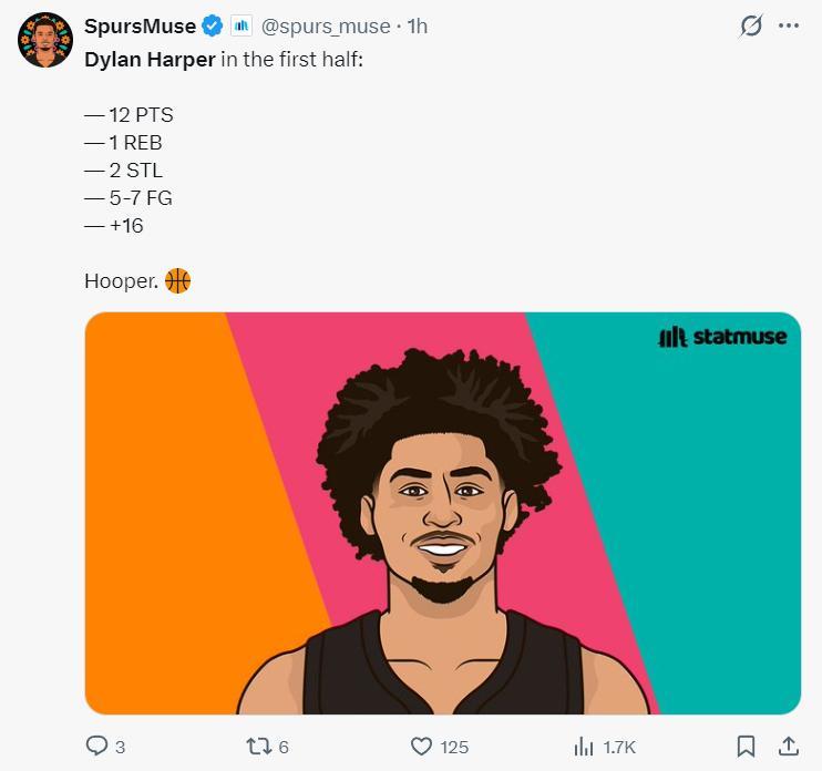 因爲馬刺的後場過多(福克斯、卡斯爾、瓦塞爾、凱爾登、麥克勞林、哈珀),所以作爲新秀的哈珀登場時間就20分鐘左右,但此役瓦塞爾受傷了,麥克勞林輪休,哈珀首節就打了7分鐘,很明顯他獲得了瓦塞爾的輪換時間,上半場16分鐘,7中5拿到12分2搶斷1籃板,正負值+16。