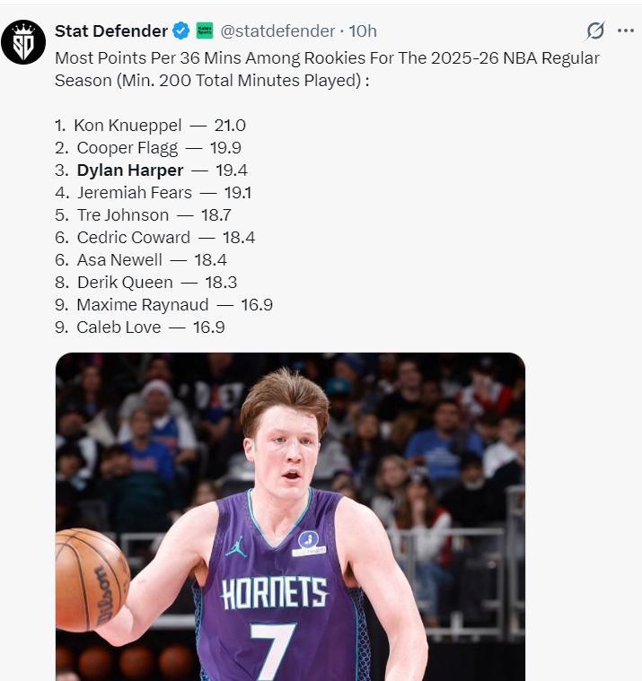 實際上本賽季新秀每36分鐘得分,哈珀場均19.4分僅次於克努佩爾21分、弗拉格19.9分,只可惜哈珀的登場時間遠不如前兩人。