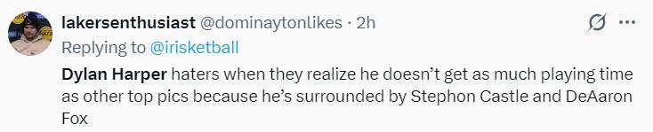 湖人球迷:那些說哈珀不穩定的、不像頂尖球員的人應該清楚,哈珀根本沒有太多登場時間,而且他身邊有卡斯爾、福克斯這樣的後衛隊友。
