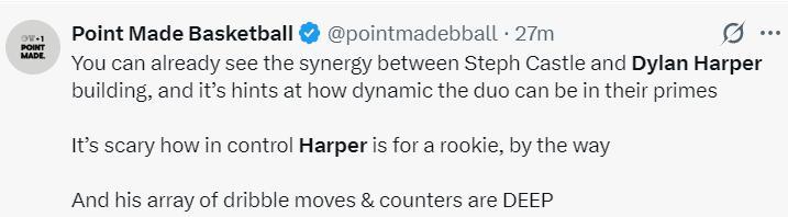 美媒PMB:卡斯爾與哈珀已經有化學反應,這暗示這對組合在巔峯期會多麼出色,哈珀作爲新秀能輕鬆掌控局面,這真令人驚歎,他的運球技巧、防守反擊技巧都非常好。