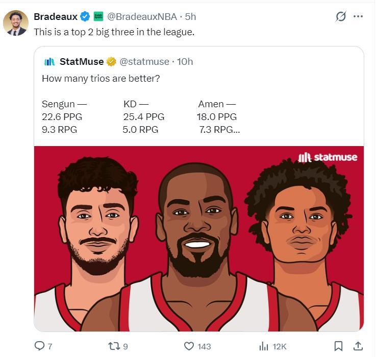 火箭記者Bradeaux轉發後寫道:這是聯盟前二的三巨頭組合。