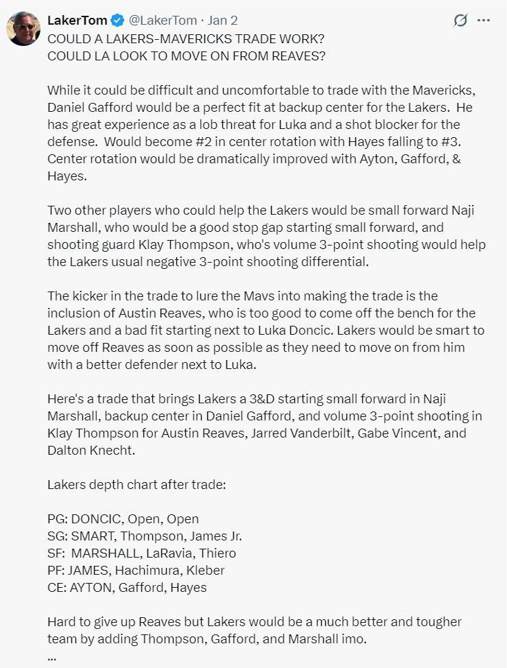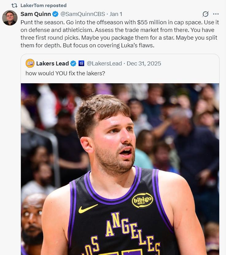 1月1日時CBS記者薩姆-奎因這樣建議:放棄這個賽季吧,休賽期手握5500萬的薪金空間,用這筆錢來補強防守與運動能力,然後還可以評估交易市場,今夏湖人有三個可以交易的首輪籤足夠打包換來一個球星,或者拆分增加陣容深度,重點是彌補東契奇防守端的不足。