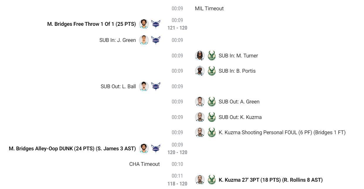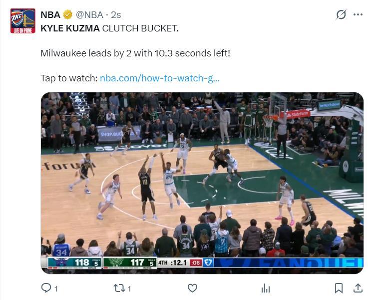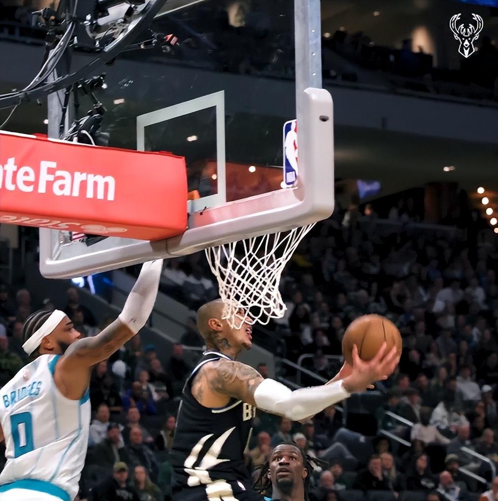 庫茲馬命中這個120-108的三分球后雄鹿全隊開始慶祝,球迷們都站起來慶祝。可很快就笑不出來,因爲布里奇斯面對庫茲馬完成了空接2+1,黃蜂121-120再度反超黃蜂。