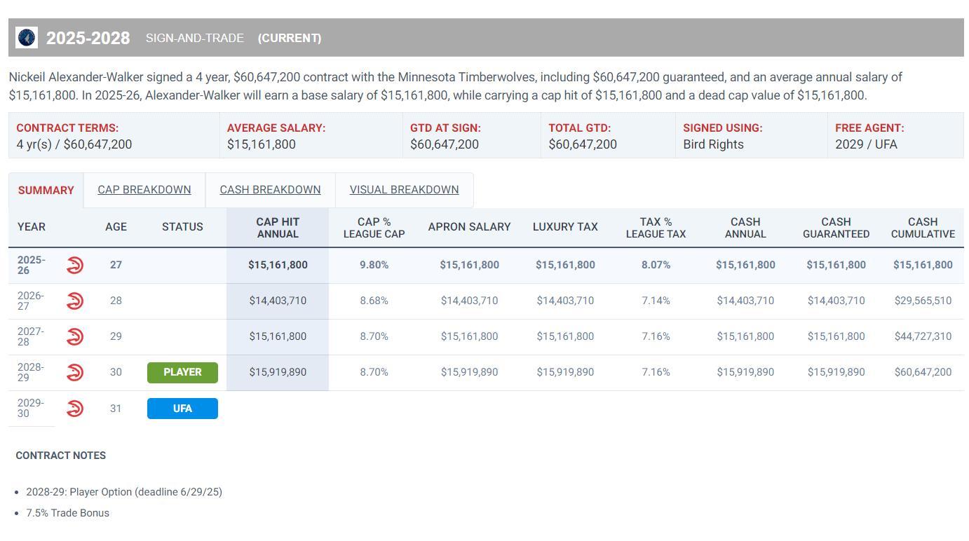 今夏老鷹用四年6060萬從森林狼那裏先簽後換得到沃克,沃克本賽季只有1516萬的薪水。