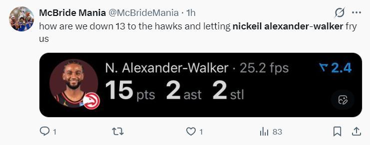 老鷹這邊亞歷山大-沃克發揮出色,他上半場11中6拿到15分2籃板2搶斷。