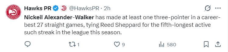 此役是沃克連續27場比賽至少命中一個三分球職業生涯最長,也跟謝潑德並列是聯盟第五長。可以說沃克來到老鷹後真的步入巔峯期。