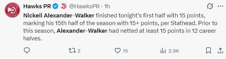 這已經是沃克老鷹生涯第15次半場拿到15+,而來到老鷹之前沃克生涯只有12次半場15分以上。